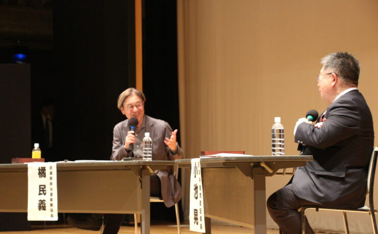 小池晃さんの講演の後は、武蔵野政治塾の橘民義・事務局長との、対談です。